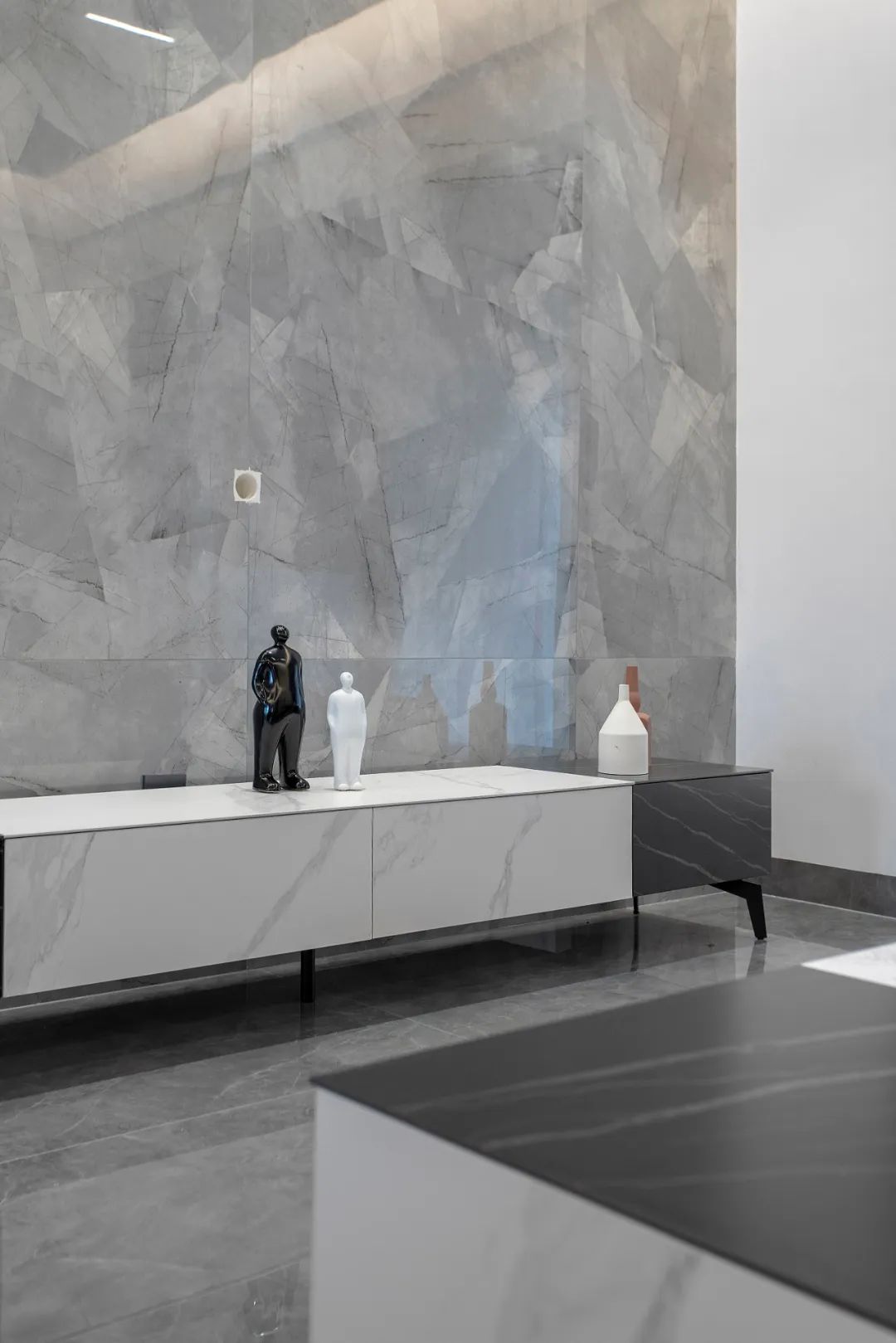 電視背景墻構(gòu)造簡(jiǎn)潔卻層次感十足,歸功于設(shè)計(jì)師對(duì)不同材質(zhì)的比例把握。