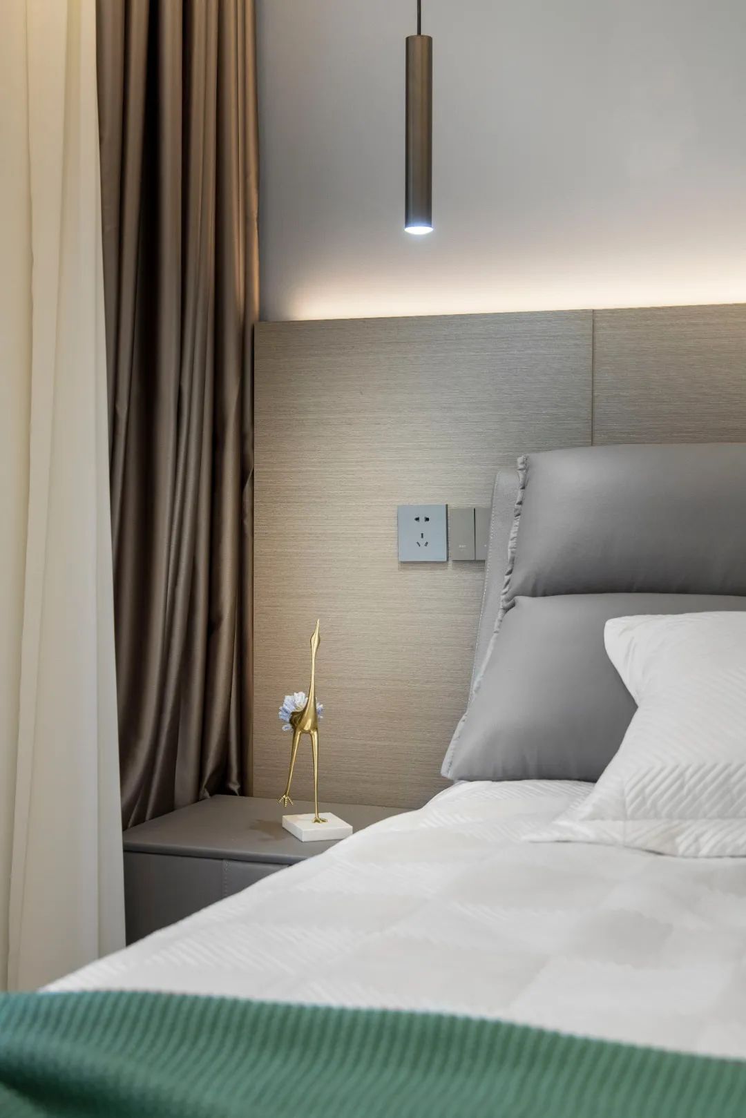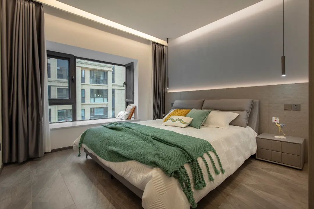 主臥暖深灰色的床頭背景墻帶來溫暖、放松的氣氛,完成空間氛圍的轉(zhuǎn)換。