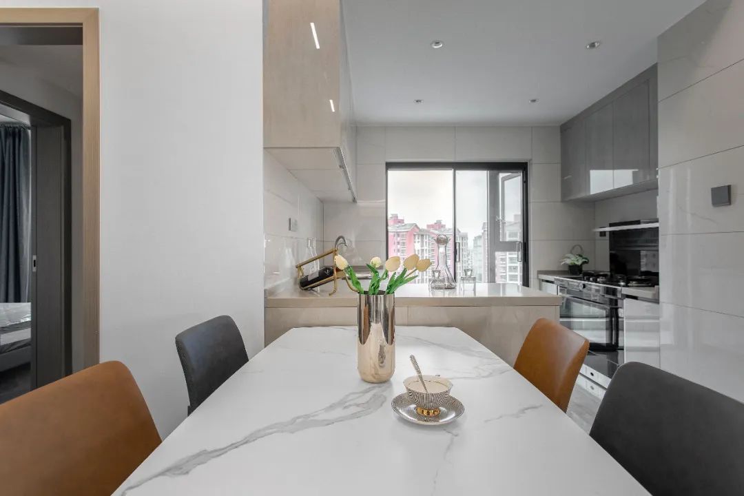 從陽臺(tái)看客餐廳,整體給人的感覺是現(xiàn)代簡(jiǎn)約、低調(diào)沉穩(wěn)的。